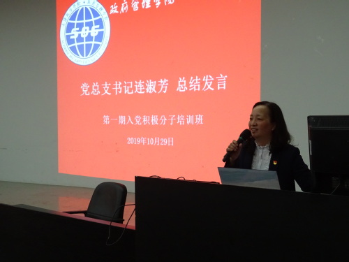 10月29日,政府管理学院在A4-蓝教室举行第1期入党积极分子培训班结业典礼,政府管理学院党总支书记连淑芳出席并作总结发言。组织员骆胖老师、第1期全体入党积极分子参与本次活动。结业典礼由学院学生党建中心宣传部部长戴高乐主持。