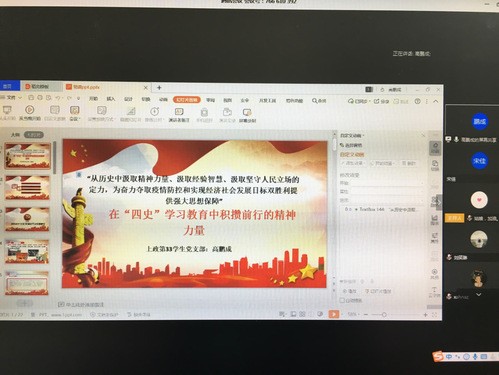 为从“四史”学习教育中积攒前行的精神力量更好地赢得疫情攻坚战,5月28日下午一点,上政第33学生党支部在腾讯会议上参加优秀毕业生党员高鹏成同学主讲的“从历史中汲取精神力量、汲取经验智慧、汲取坚守人民立场的定力,为奋力夺取疫情防控和实现经济社会发展目标双胜利提供强大思想保障”主题党课。