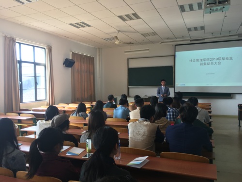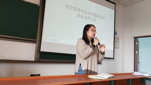 为提升学生的就业动力和热情,给学生提供更专业的就业指导,10月30日上午,社会管理学院在A8-201举行2019届毕业生就业动员会。学院党总支副书记陈娜以及带毕业班的辅导员出席会议,会议还邀请“一起求职”华东区总监曹元东为毕业生提供求职指导。
