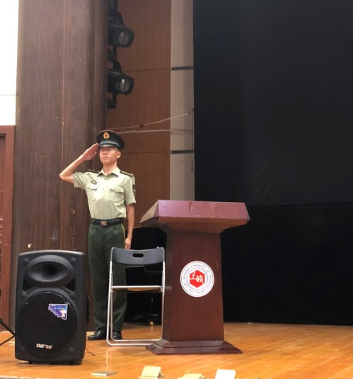 大会在嘹亮的国歌中拉开帷幕,会议中,李纬明、项斐、张驰老师分别对军训期间军容风纪、宿舍内务以及集体与个人评奖评优办法三个方面分别进行讲解,三位老师的讲解进一步加强参训学生对军训期间的要求以及相关荣誉争取的了解;退伍学生代表杨庆滨向同学们讲述自身军旅经历与感悟,他以别具一格的方式激励同学们燃起军训斗志,鼓励同学们通过军训磨练自己,并提高集体荣誉感;军训导生代表黄海琪明确导生指责,并代表政府管理学院2019年军训导生向新生做出承诺,同时作为已参训学生传递参训经验;参训学生代表黄雅婷同学的发言铿锵有力、激情澎湃,言辞中表达对军训的期待以及严守纪律与接受考验的决心;之后,黄雅婷同学带领全体新生进行参训宣誓:服从命令,听从指挥;尊重教官,刻苦训练;遵守纪律,磨炼意志;团结有爱,知行合一;不怕困难,奋勇争先;为班级争光,为政管添彩!