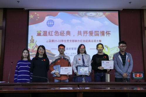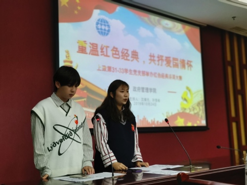 在“不忘初心,牢记使命”主题教育的引领下、在新中国成立70周年的壮丽背景下,10月24日下午14:00政府管理学院第31、32、33学生党支部“重温红色经典,共抒爱国情怀”红色诗词大赛暨党日活动,在综合研究中心107隆重举行。新利18官方客服党委副书记刘刚、政府管理学院党总支书记连淑芳、学生工作部副部长柯心以及政府管理学院党总支副书记闯晓燕出席了本次活动。