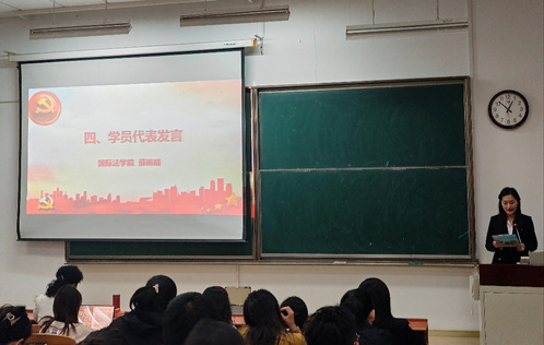 国际法学院学生薛雨晴作为学员代表发言。薛雨晴深刻认识到,理论学习并非可有可无的“附加项”,而是支撑党员坚定理想信念、提升政治素养、明晰行动方向的核心基础,更是从“思想上入党”向 “行动上入党”深化的根本前提。 薛雨晴分享自己参与培训的态度:三个“心”,一是“虚心”,放下“已经入了党就足够”的松懈心态;二是“用心”,践行“学思用贯通、知信行统一”的要求;三是“恒心”,力争筑牢常态化学习根基,把所学转化为服务同学、建设校园的实际行动。