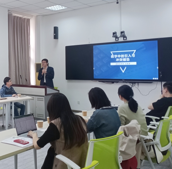 方瑞安以“教学中的引入与冲突铺垫”为主题进行教学经验分享。在日常教学过程中,他坚持将直接引入、问题引入、实例引入等引入环节作为课堂教学的前奏,创造性地将戏剧理论运用于课堂教学,坚持“没有冲突就没有戏剧”即“没有冲突就没有课堂”的理论,通过寻找“理性与直觉的冲突”与“元命题冲突”来完成课堂教学。