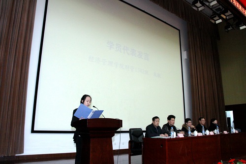 经济管理学院财管1342班朱敏同学作为学员代表发言,表示将更加严格要求自己,以更加认真的态度对待学习,以一名党员的标准严格要求自己,做好模范带头作用。刑事司法学院监狱学1321班楼子涧同学带领全体学员庄严宣誓:在培训期间严格遵守学习纪律,不断提高思想认识,坚持理论联系实际,处处起到模范带头作用,争取早日加入党组织。