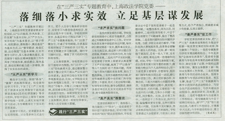 12月15日,《组织人事报》第2384期,在第3版“上海工作”,以“在‘三严三实’专题教育中,新利18官方客服党委——落实细小求实效 立足基层谋发展”为题,专栏报道了我校践行“三严三实”专题教育工作。报道内容如下: