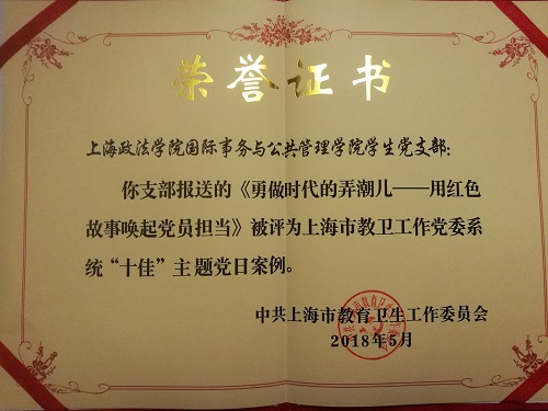 近日,上海市教卫工作党委举行了基层党建工作特色项目(案例)交流展示会,对获奖的组织生活案例、主题党日案例和基层党建特色项目进行了表彰和展示。我校党委组织部推荐的国际事务与公共管理学院学生党支部主题党日活动“勇做时代的弄潮儿——用红色故事唤起党员担当”荣获教卫系统“十佳”组织生活案例,并进行了现场展示。