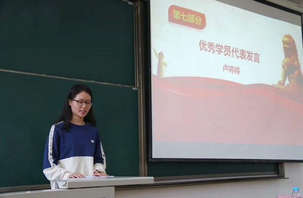 优秀学员代表卢婷婷同学上台发言,她表示今后要更加努力向党组织靠拢,严格要求自己,争取早日入党。