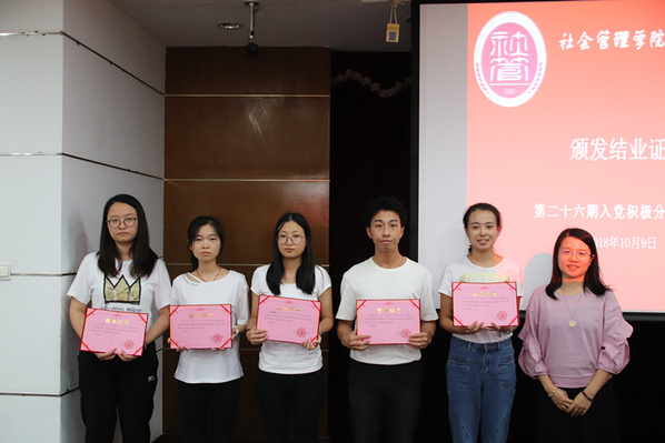 10月9日下午,社会管理学院第26期入党积极分子培训班结业典礼在求实楼513会议室举行。学院党总支书记连淑芳,党总支副书记陈娜,辅导员谢一泓,组织员骆胖和培训班33名学员参加结业典礼。