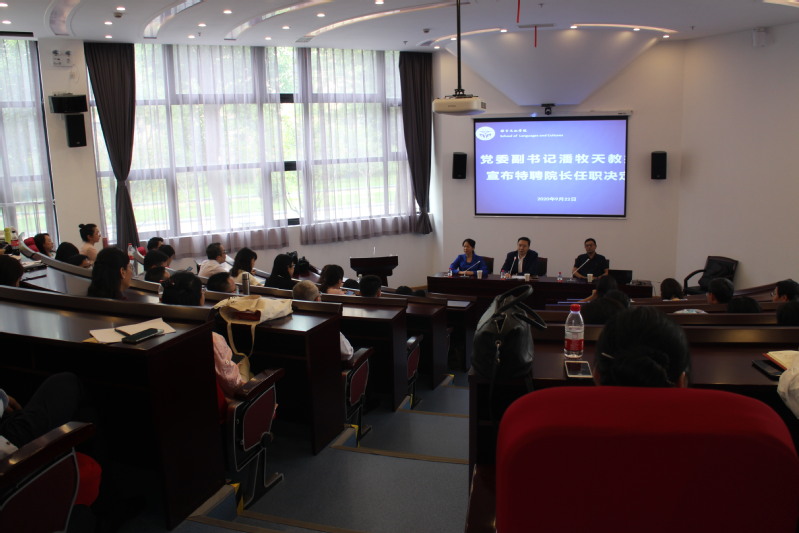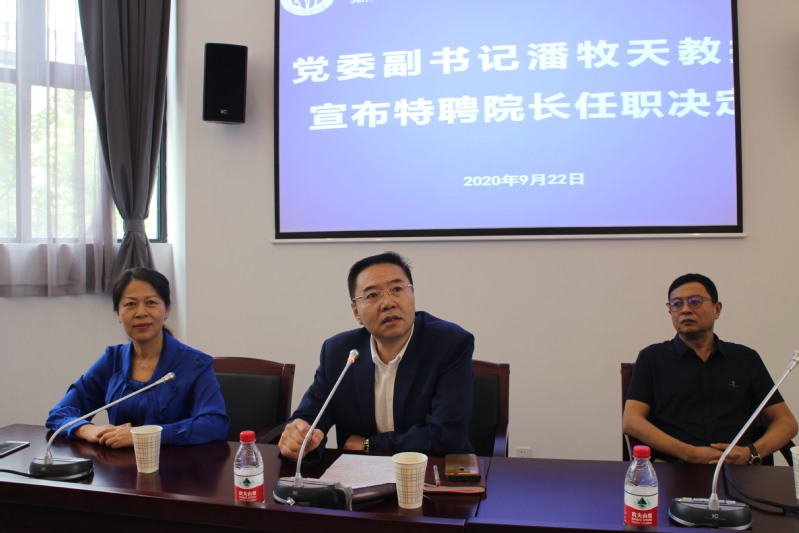 潘牧天代表学校党委宣布聘任倪传斌教授为语言文化学院特聘院长的决定,传达了学校对学院工作的重视,并就学院未来发展提出殷切希望。