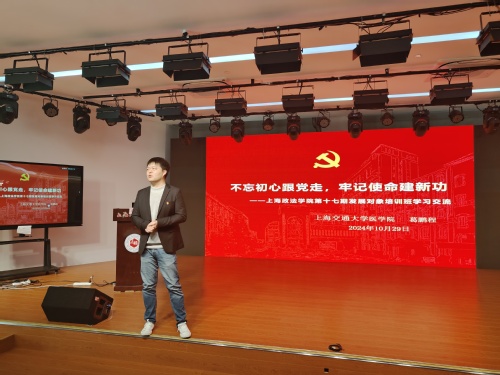 上海交通大学医学院党委组织员葛鹏程作“不忘初心跟党走,牢记使命建新功”专题党课。葛鹏程从中国共产党的初心使命导入,通过一个个生动的党史故事,回顾中国共产党的伟大发展历程,向学员们重点阐述了如何坚定理想信念,成为一名新时代合格共产党员。